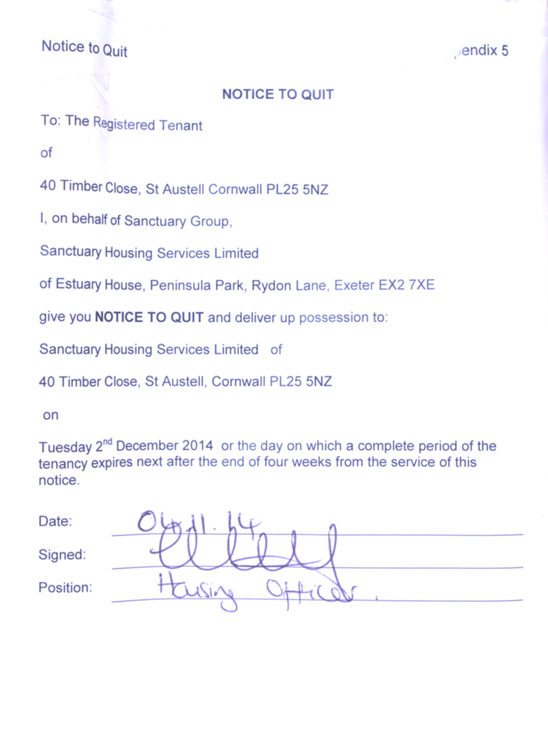The ‘Notice To Quit’ the property by 2nd December 2014.